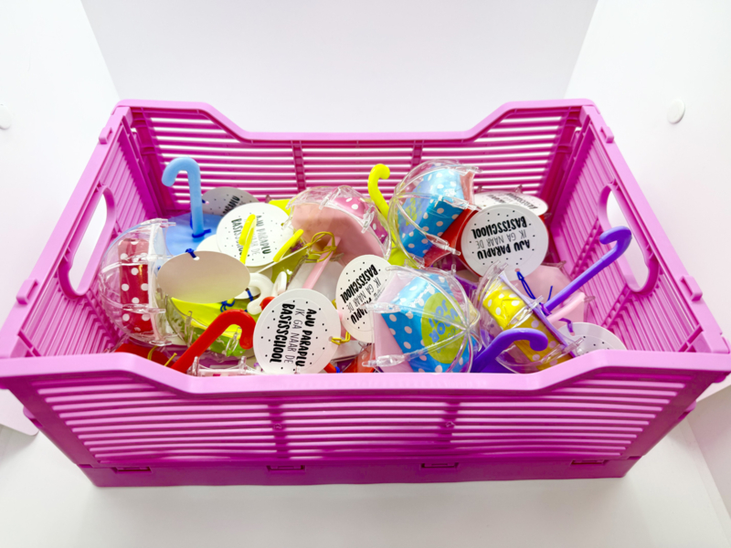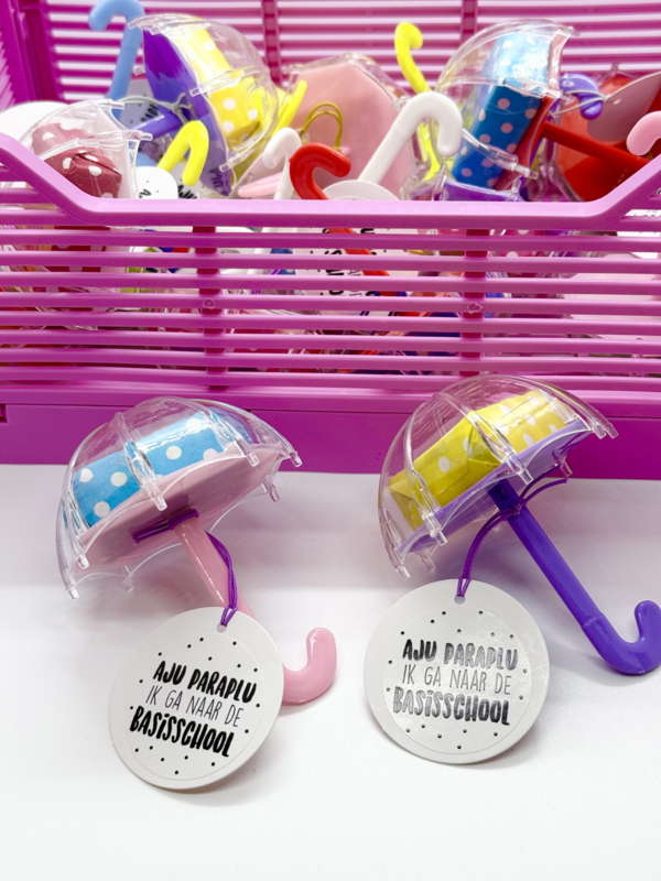 Zoek je een originele en kant-en-klare afscheidstraktatie voor het kinderdagverblijf (KDV) of de peuterspeelzaal? Deze "Aju Paraplu" traktatie is het perfecte kadootje wanneer jouw kleintje de overstap maakt naar de basisschool.